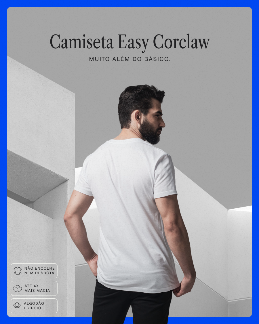 A Camiseta Easy mantém o padrão de qualidade Corclaw: algodão egípcio com elastano, toque macio, caimento premium e durabilidade para anos de uso.